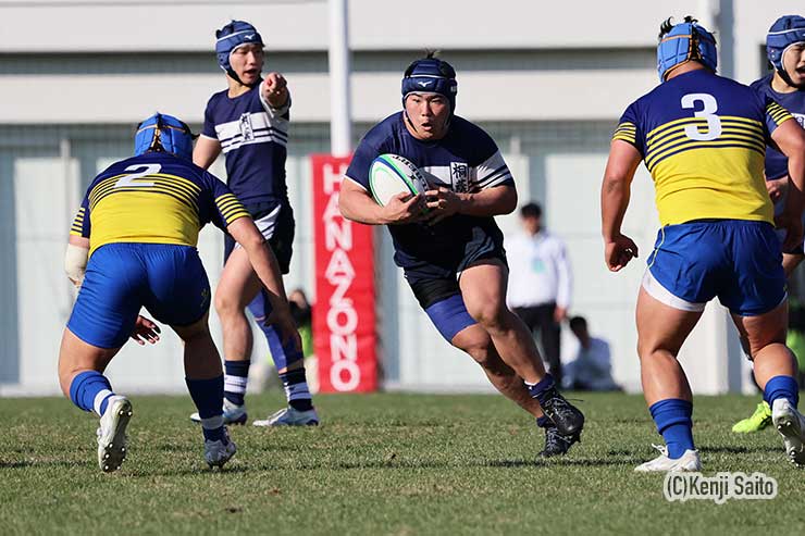 京都成章との決勝。前半、桐蔭学園は徹底したFW戦を挑んだ。キックオフ直後のスクラムからのアタック。桐蔭学園はセットプレーからワンパスクラッシュ、ワンパスクラッシュを徹底して反復。FWが徹底して体を当て続けた。キックオフ直後の相手落球で得たスクラムから14フェイズ、次のスクラムからは9フェイズ、そのあとも7フェイズ、10フェイズと攻撃を継続する。だが京都成章はピラニアの異名をとるしつこく正確なタックルで桐蔭学園のアタックを止め続ける。