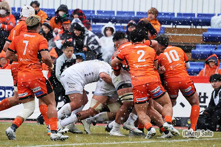 雪が降る中の一戦となったが、スピアーズがFW戦で有利に戦うと、BK陣も躍動し、WTB山田響、SH藤原忍らがトライを挙げて前半は31-7で折り返した。その後もキャプテンのNO8マキシ ファウルアがハットトリックの活躍を見せて48-14で快勝。“えどりく〟での連勝記録26に伸ばした。