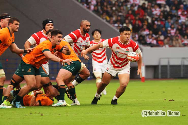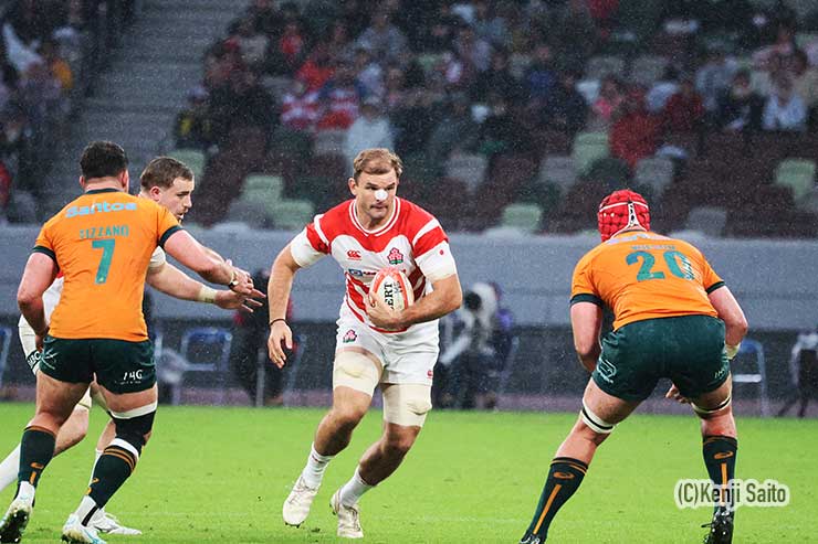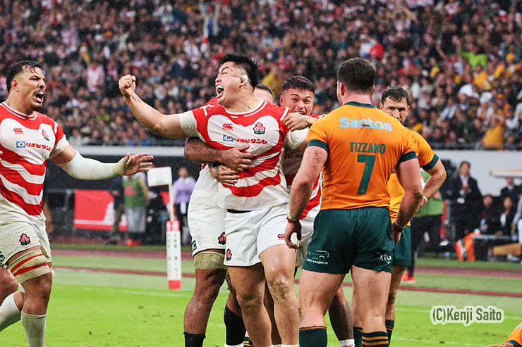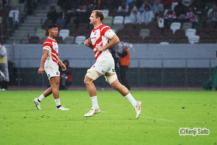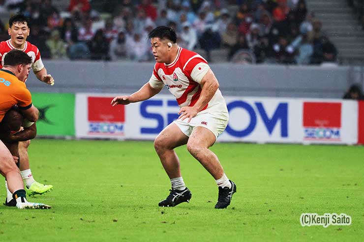 ミスマッチでもあったし、すごく僕の好きなスペースだったので呼びました。嬉しかったですね。個人で取れたから喜んだというよりは、チームの結果としてつながったスコアだったんで、めちゃめちゃ嬉しかったですね。その前に僕はイエローカードもあったし、チームに迷惑をかけていたんで、なんとか、チームに貢献できるのはスクラムとボールキャリーだったので、まずはスクラムでペナルティ取って、そこからのスコアだったので、自分の仕事を遂行できたのは良かった。