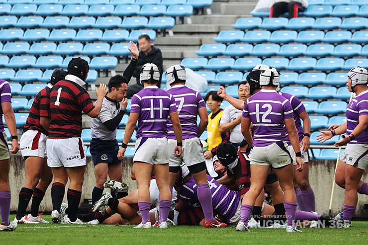 キックオフ直後のの接点でプレッシャーをかけた目黒学院が相手のペナルティを誘ってマイボールへ