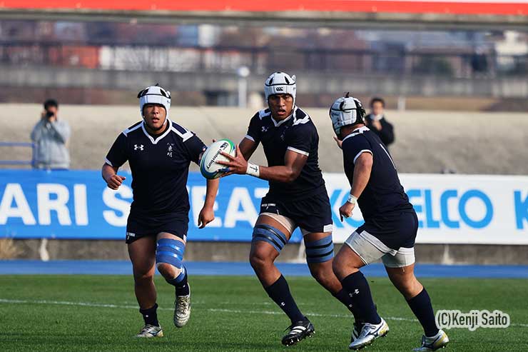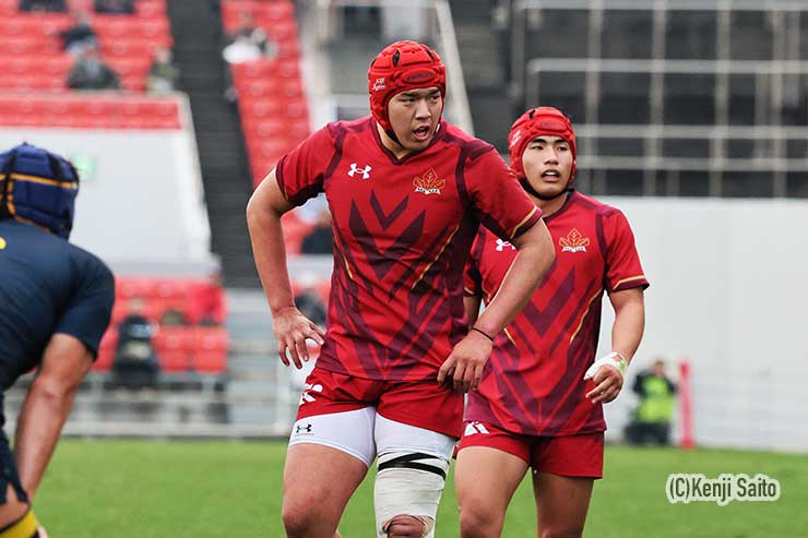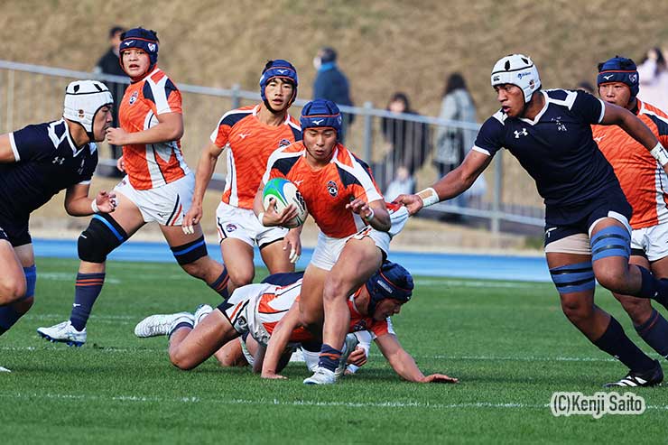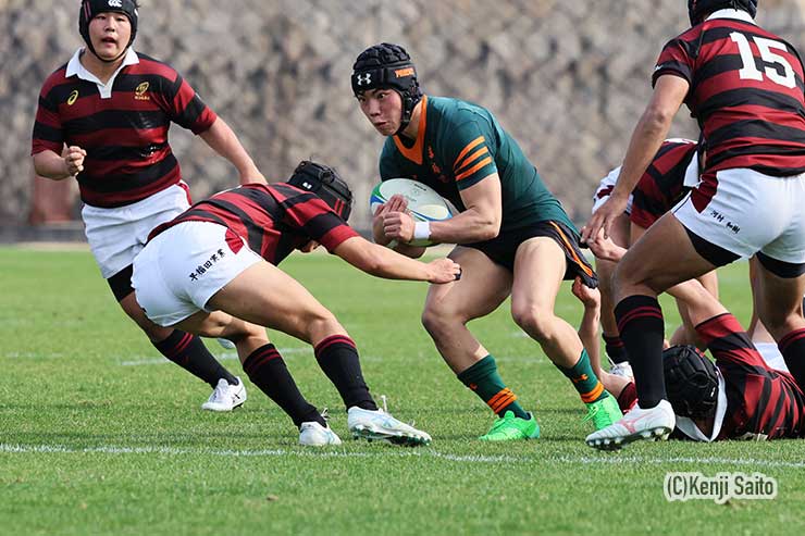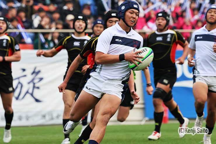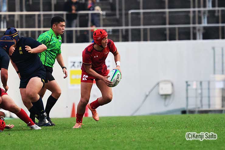 拮抗した展開が続きスコアが動いたのは14分。右サイド桐蔭学園CTB古賀がブレイク。PR嘉がクラッシュし、相手ディフェンスを引き付けると竹山からのキックパスを受けた西本が再び左隅にトライ。22-5とリードを広げた。