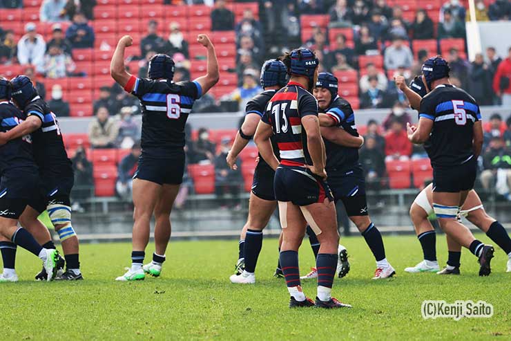 24-12と慶應志木がリードする後半23分、鹿実が自陣22m内側でペナルティ。慶應志木はタッチに蹴り出しトライを狙いにいく。ゴール前ラインアウトから、モールを組む慶應志木。鹿実がオフサイド。再びタッチに蹴り出す。モールを組む慶應志木、CTB浅野優心(3年)がパワーで相手ディフェンダーをなぎ倒しトライ。SH荒木大志(3年)のゴールを決めて31-12とし勝負を決めた。