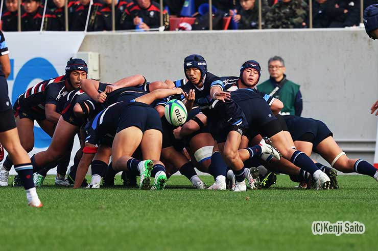 互いに激しい攻防で均衡が崩れたのは15分、PR岡田佑獅朗(3年)から内に返すパスでFL佐藤凌吾(3年)が抜けてトライ。26-5とリードを21点差に広げた。