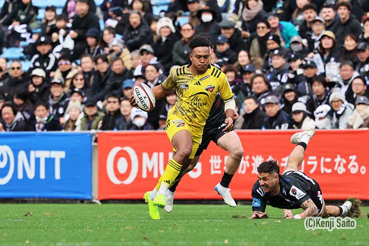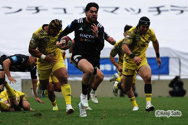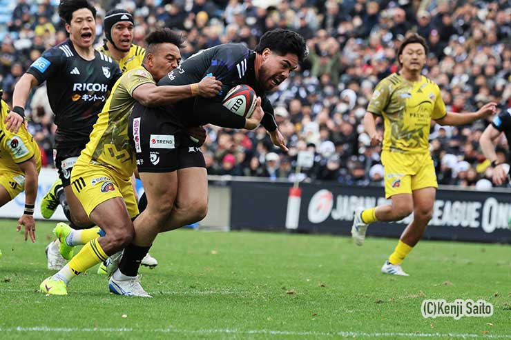 そのまま勢いにのったサンゴリアスは、28分、キックをキャッチした相手にFB松島がタックルし、そのボールを味方がターンオーバー。途中出場のHO宮崎達也が飛ばしパスを決めて、最後はWTBチェスリン・コルビがトライゾーンに押さえた。さらに39分、相手にイエローカードが出て、数的有利となるとスクラムからボールを継続、最後は途中出場のCTB中村亮土が右中間にトライを挙げてノーサイドを迎えた。