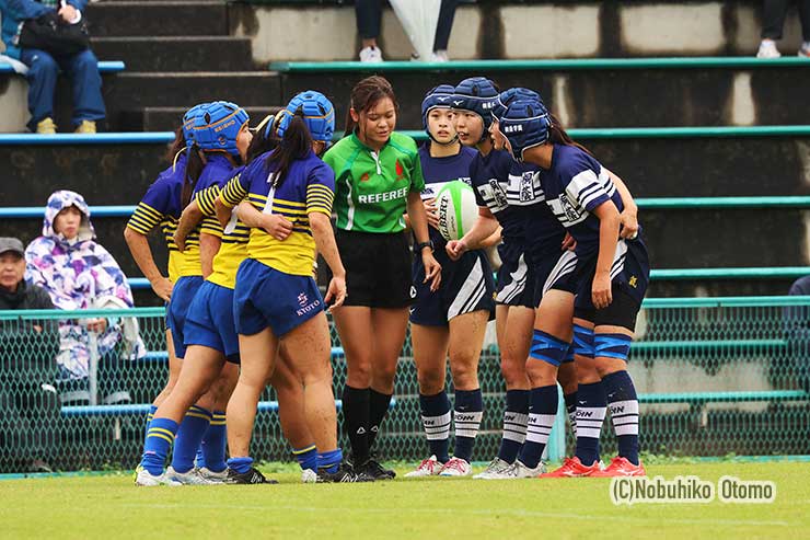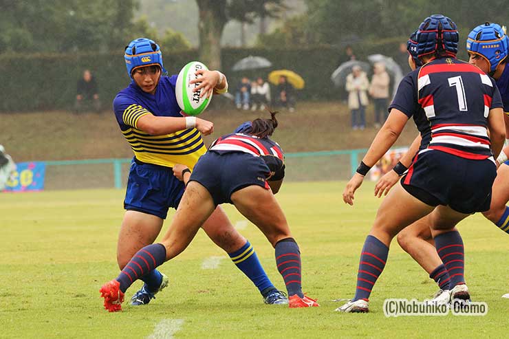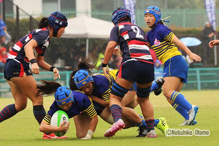 好機に決め切れなかった六浦だが、ハーフタイム直前、メリノールのアタックでの落球を六浦・浅利主将が拾ってカウンターアタック。右に⑦島津が大きくゲインすると、⑤青山羽菜が左へ大きくゲイン。フェイズを重ねて、再びボールを持った青山が相手DFの隙間を突いてトライエリア中央まで回り込んでトライ。自らコンバージョンも決め7-7の同点でハーフタイム。