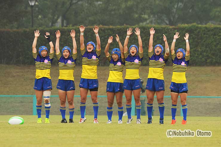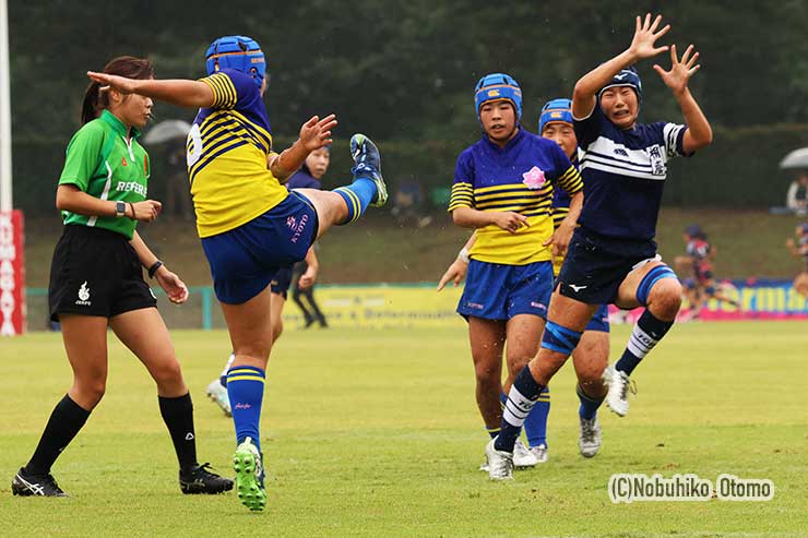試合開始から京都成章は相手ゴールに迫るが、桐蔭学園は粘り強いDFでパスミスを誘いボールを奪うとカウンターアタック。約90mを切り返して①冨樫結衣が先制トライ。前半を17-0とリードすると後半6分にも冨樫がトライ。京都成章も諦めずに反撃を試み続け、ロスタイムに⑧百野毬亜が意地のトライを返した。