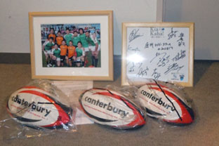 チャリティマッチの時に撮影した選手の集合写真と、選手のサイン一式。それからラグビーボール3個を寄贈しました。