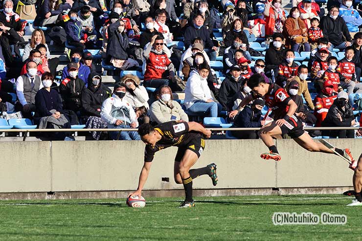 27分、尾崎晟也のトライで20-17とリードして前半を折り返した