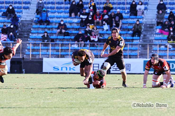 序盤クルーデンのPG2本で6-0とリードすると、前半21分、NO8テビタ・タタフのトライで13-3とリード。さらに27分、WTB尾崎晟也のトライでリードを広げるも前半終了間際にブレイブルーパスにトライを許し20-17と3点リードして前半を折り返す。