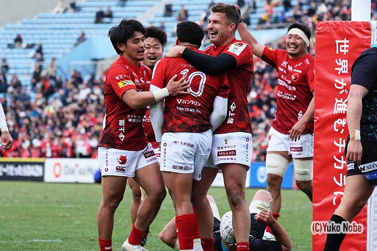 持ち前のアタック力を見せたブレイブルーパスは、前半は12-3とリードして折り返した。しかし後半はスピアーズの反撃にあって12-17と逆転されてしまう。しかし、17-20で迎えた後半40分、FW、BK一体となってボールを継続し、最後は元オールブラックスのSOリッチー・モウンガがパスダミーから内に切れ込んでトライを挙げて24-20で逆転勝利を収めた。