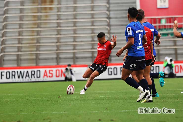 前半、2本のトライを許すも、松田力也が1本のドロップゴールと4本のペナルティーキックを決め15-17と2点差で折り返す。