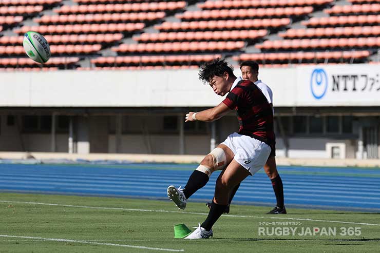 29分にゴール前のペナルティからクイックリスタートしたSH細矢がトライを決めて逆転すると、足が止まった立教はミスを連発。33分には、矢崎がトライを決めると37分にも矢崎の突破からCTB金子礼人がトライをきめ26-6とリードして前半を折り返した。