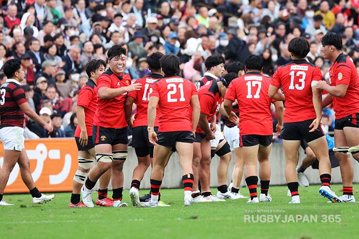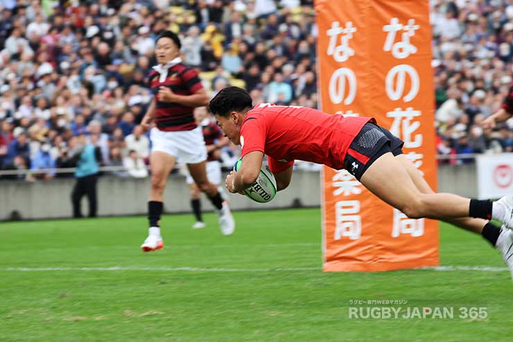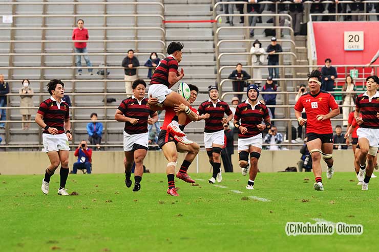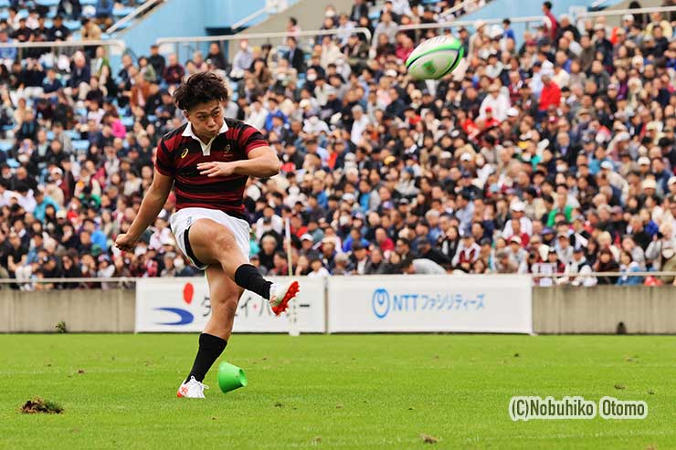 帝京は前半32分、キックオフからボールを獲得すると一気に攻勢をかけてPR上野凌大がトライを決めて再逆転すると、前半終了間際にもペナルティキックを獲得するとCTB大町佳生がPGを落ち着いて決めて22-13とリードして前半を折り返した。