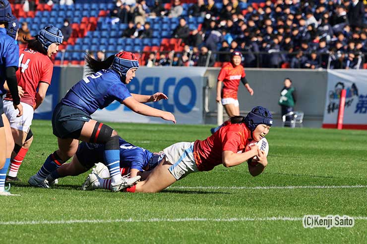 開始3分、東軍は最初のスクラムからNo8大橋愛莉(関東学院六浦③)のアタックでPKを獲得。右ゴール前のラインアウトに持ち込むと、ラインアウトからの3次攻撃でLO浅利那未(関東学院六浦③)がポスト下に飛び込み先制トライ。FB青山羽菜(関東学院六浦③)がコンバージョンを蹴り込み東軍が7点を先行する。
