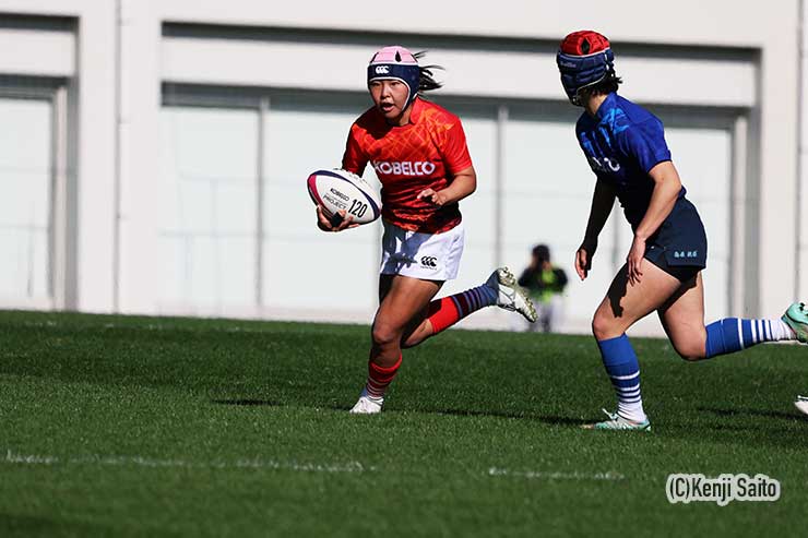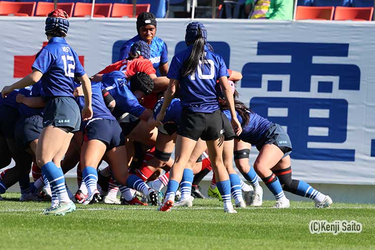 リードされた西軍は10分、左サイドをWTB吉川まなみ(石見智翠館③)がブレイクして敵陣深くへ。19分にはSO大内田彩月(修猷館②)からFB中野栞捺(佐賀工③)-WTB船川陽菜(佐賀工③)という九州ラインの鮮やかなムーブが決まり、船川が相手ゴール前に迫るが、ここは東軍FB青山がトライライン寸前で倒し、WTB中野亜胡(麗澤③)がジャッカル(スティール)に入りトライセーブ。東軍が粘り強いディフェンスで耐え、前半は東軍が12-0とリードして折り返した。