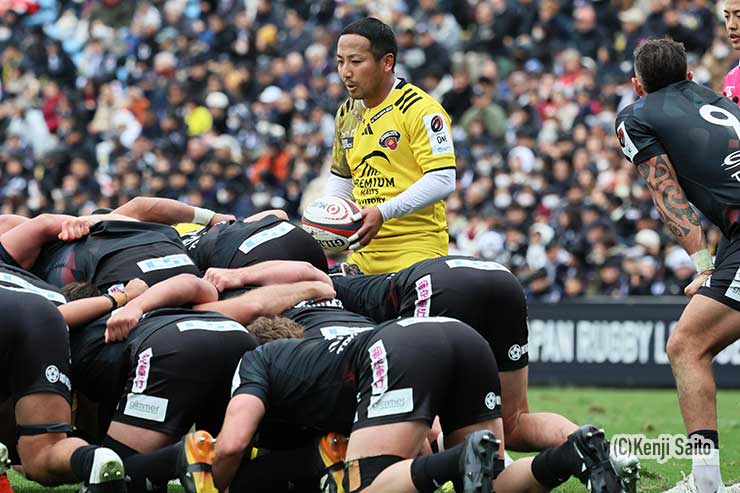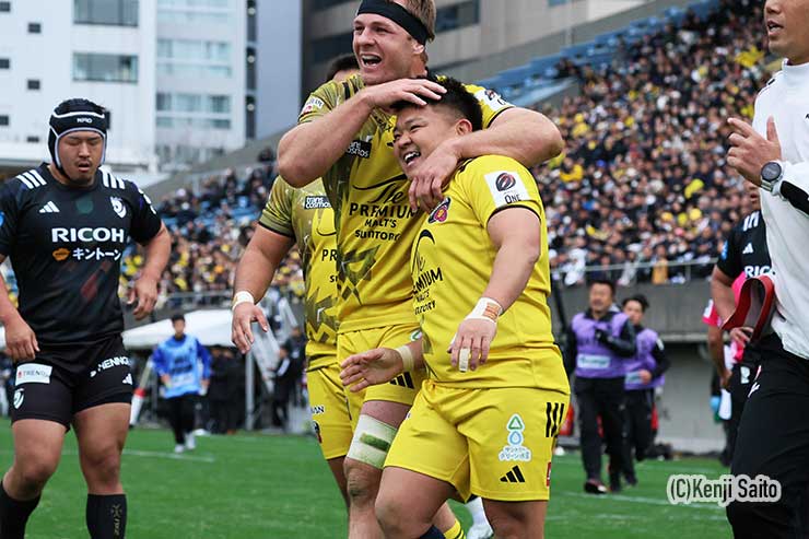 そのまま勢いにのったサンゴリアスは、28分、キックをキャッチした相手にFB松島がタックルし、そのボールを味方がターンオーバー。途中出場のHO宮崎達也が飛ばしパスを決めて、最後はWTBチェスリン・コルビがトライゾーンに押さえた。さらに39分、相手にイエローカードが出て、数的有利となるとスクラムからボールを継続、最後は途中出場のCTB中村亮土が右中間にトライを挙げてノーサイドを迎えた。