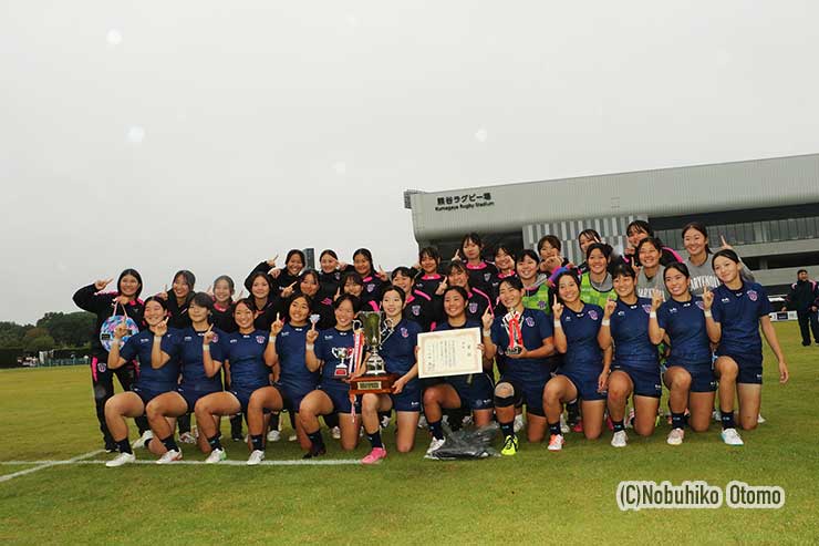 後半も息詰まる攻防が続き、スコアが動いたのは後半4分だった。自陣のスクラムでFKを得た六浦がアタックに出るも、滑るボールに落球。そこにメリノールの河内主将が猛然と飛び込んでフロントセービング。そのボールを②赤木陽菜子が拾い上げると⑤原田唯衣へ。六浦は⑥伊藤千尋が必死に戻ってタックルするが、原田は倒されながらオフロードパス。これを捕ったメリノール②赤木が、標的を変えた伊藤のタックルを受けながら右中間に決勝トライ。残る2分間も思い切りのいい出足で六浦のアタックを寸断し続け、最後はボールをキープすると、冷静にレフリーに時間を確認した上で蹴り出しノーサイド。落ち着いたゲーム運びで初の王座をつかみ取った。
