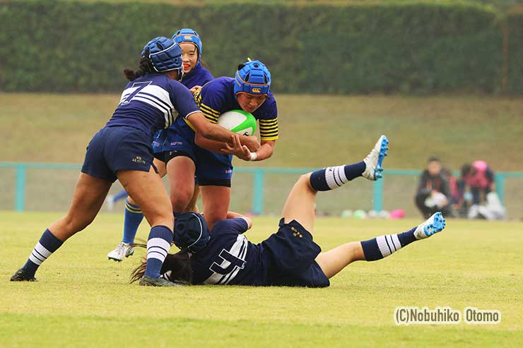 六浦はアタックを継続。④佐藤多恵がゴール前に持ち込むもノットリリースザボールでトライならず